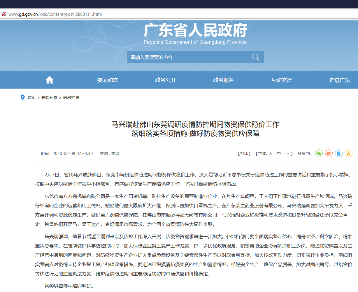 2020年2月7日,馬省長等省市領導一行,來我廠考察指導工作。在這特殊的時期里,馬省長一行的到來,讓全公司上下備受鼓舞,將全員一心,全力以赴貫徹省市領導的指示精神,更多更快更好的生產口罩機,保質保量完成訂單,為抗擊疫情提供強有力的口罩生產設備保障。