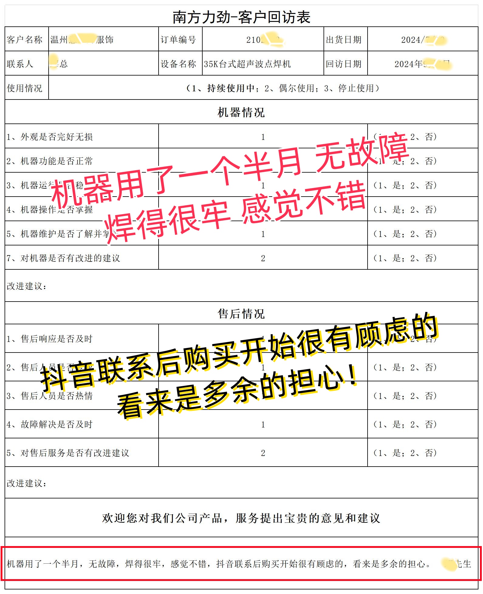 這位客戶(hù)在使用超聲波點(diǎn)焊機(jī)一個(gè)半月后,給予了如此高的贊譽(yù)。無(wú)故障運(yùn)行,焊接牢固,這不僅是對(duì)設(shè)備性能的肯定,更是對(duì)我們品牌的信任。 一開(kāi)始的顧慮,在實(shí)際使用中煙消云散,充分證明了我們的超聲波點(diǎn)焊機(jī)經(jīng)得起考驗(yàn)。