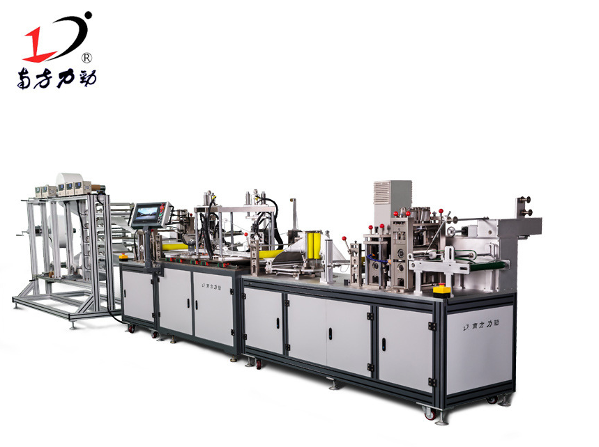 此外值得一提的是,此款口罩生產環境及生產設備,口罩、手套、防護服等耗材都需在凈化車間中生產。設備使用的是東莞市南方力勁機械有限公司所生產的全自動聯動一體折疊口罩機,從原材料3~6層,自動化完成作業,其中包含制作工序有自動印刷、自動上鼻梁條、折疊成型和耳帶焊接;設備通過伺服送料,定位系統與每個制作工位 配合, 的生產出折疊口罩;為了應付市場需求,根據產品可以對模具進行調整,生產出各式各樣的折疊口罩,拓展市場占有的份額;國家高新企業 折疊式設備生產線。