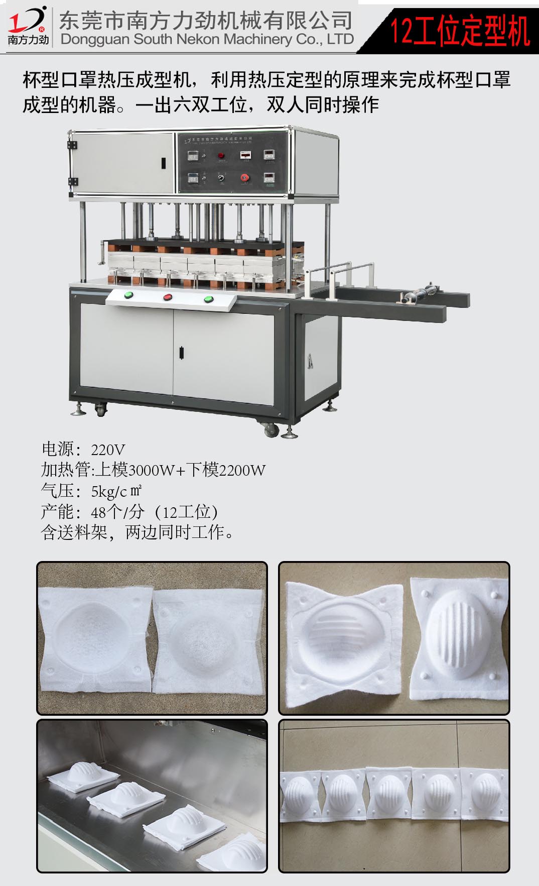 杯型口罩熱壓成型機,又稱杯型口罩成型機,N95口罩熱壓成型機,用于杯型口罩的初步成型;此款機器主要是利用熱壓定型的原理來完成杯型口罩成型的機器。分為一出四單工位,一出四雙工位(雙人同時操作),一出六雙工位(雙人同時操作)等款。
