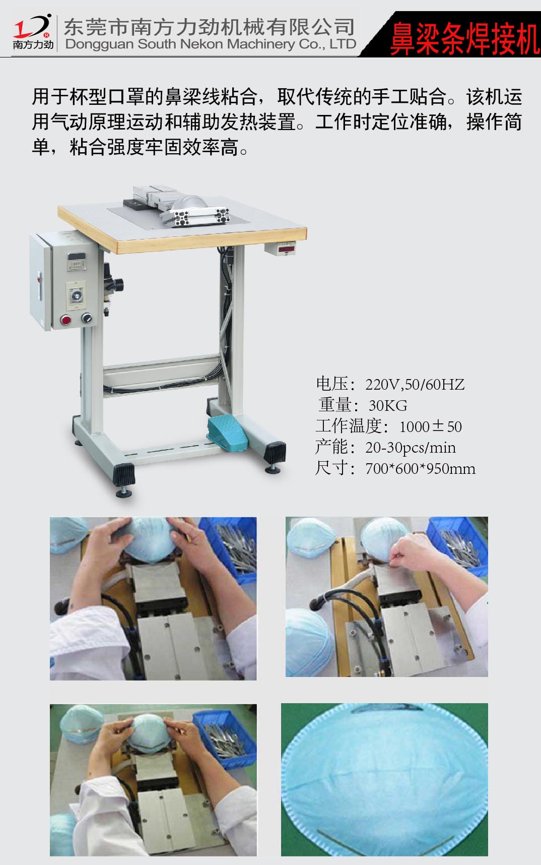 主要適用于杯型口罩的鼻梁線粘合,取代傳統的手工貼合。該機運用氣動原理運動和輔助發熱裝置。工作時定位準確,操作簡單,粘合強度牢固效率高;是N95/杯型/立體/防塵口罩制造行業的理想設備。